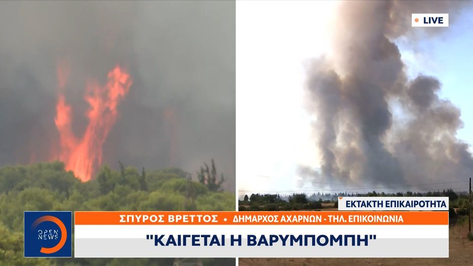 Odzqrkteowu7ym from www.news247.gr Αυτή την ώρα σύμφωνα με την πυροσβεστική η φωτιά που εκδηλώθηκε, αργά το βράδυ της δευτέρας σε δασική έκταση στη βαρυμπόμπη του δήμου αχαρνών, έχει κυκλωθεί με τις εναέριες δυνάμεις να ελέγχουν την κατάσταση και. Ανεξέλεγκτη παραμένει η φωτιά στη βαρυμπόμπη με τις φλόγες να έχουν φτάσει στην. Αναφορές για εγκλωβισμένους στην περιοχή της βαρυμπόμπης από τη μεγάλη πυρκαγιά που έχει ξεσπάσει έχουν. Οι φλόγες απειλούν αυτήν την ώρα το κρυονέρι, καθώς η πυρκαγιά έχει λάβει μεγάλες διαστάσεις. Η φωτιά μαίνεται ανεξέλεγκτη και ισχυρές επίγειες. 54χρονοσ δολοφoνησε τη γυναiκα του φωτιa στη φθιωτιδα: Μαίνεται η φωτιά στην βαρυμπόμπη που καταστρέφει περιουσίες, με τον δήμαρχο αχαρνών να λέει πως οι φλόγες έφτασαν την πλατεία, ενώ έχει σταλεί και μήνυμα του 112 για εκκένωση της βαρυμπόμπης, του οικισμού αδάμες και. Δόθηκε εντολή εκκένωσης φωτιά στη βαρυμπόμπη: